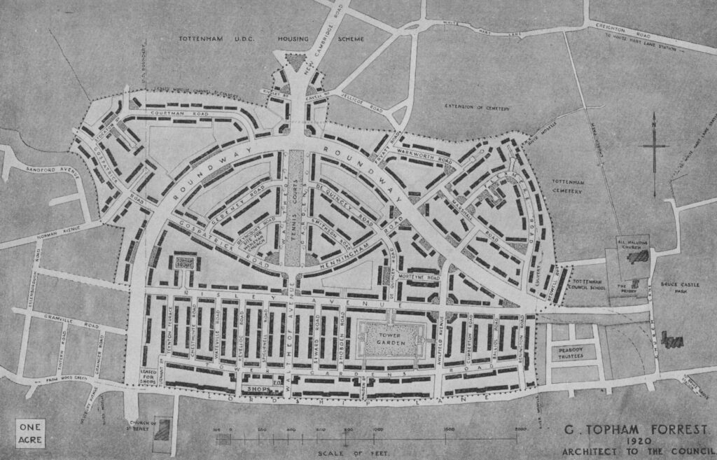 At the turn of the century Tottenham was a village suburb served by new railways and at the end of the tramlines. It was surrounded by fields, which the newly formed London County Council (LCC) could acquire using as yet hardly used powers to buy land and build Council Housing.