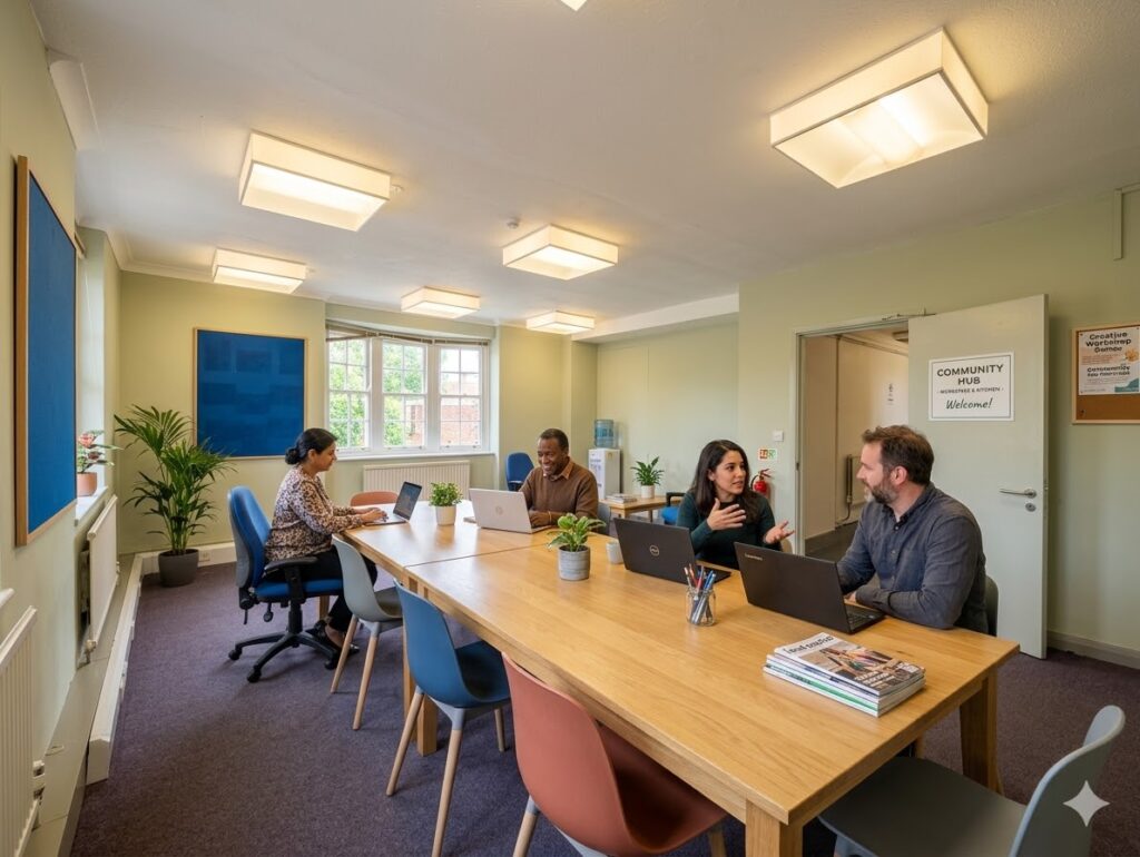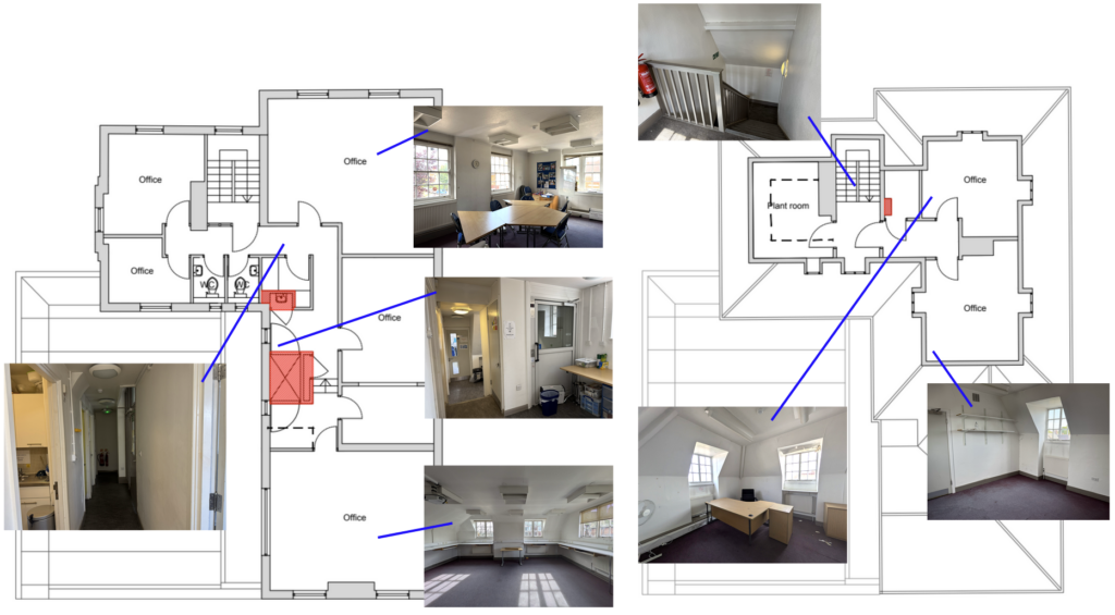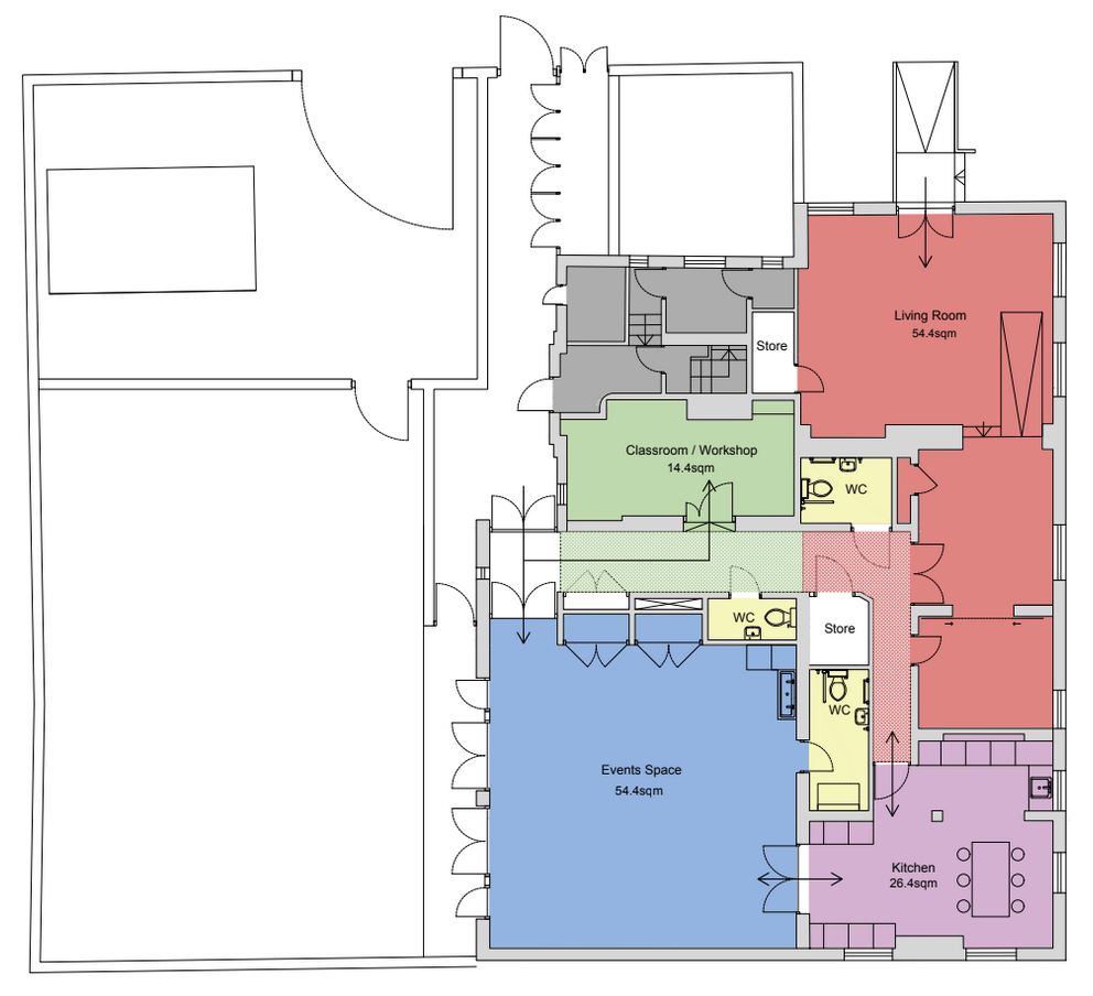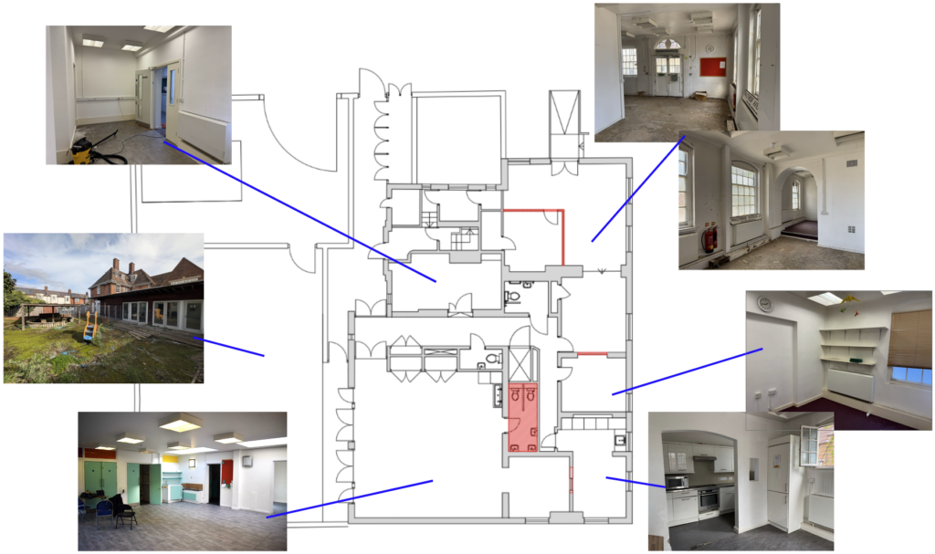 In case you wanted to get a better sense of the space, or haven’t been to one of our workshops in the building yet, we’ve put together a few photos, floor plans and AI generated mock-ups of how the space could be used – hoping we will be able to replace them with some real photos soon!