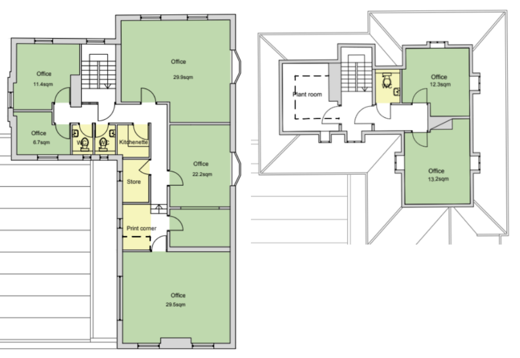 Upstairs there are two more floors. The first floor consists of office space with a kitchenette, two loos and an accessible lift. Two of the rooms are very big, and one was used for workshops in the past. The second floor has two smaller rooms with a great view over the estate.