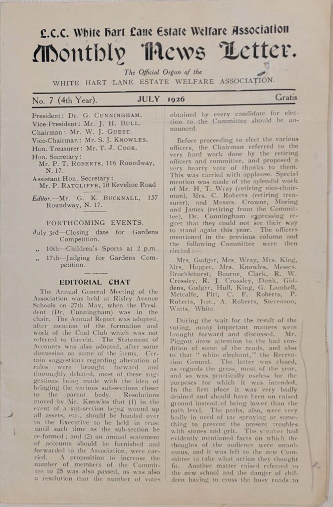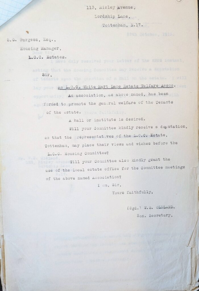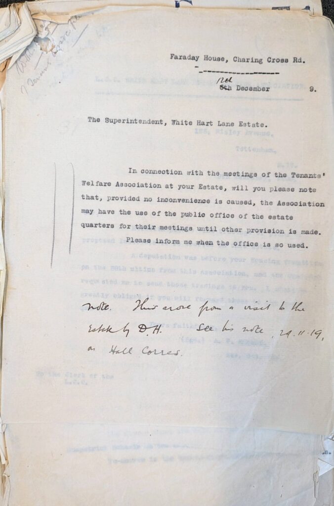 Residents Group is formed and starts asking for “a hall or institute” on the estate. It calls itself the White Hart Lane Estate Welfare Association.
